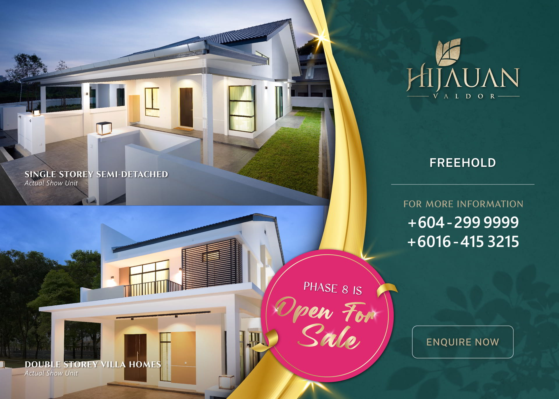Imagine your very own home, nestled in the landscaped treasures of verdant greens, Hijauan Valdor offers you great choices for spacious home designs, surrounded by vast natural ambience, and located conveniently close to Penang Island. Come experience the unbounded freedom and comforts of a landed residence on the mainland, within an exclusive 24-hour guarded community, designed to help you fulfil all your lifestyle aspirations.